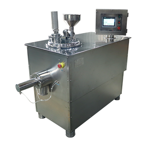 本機用于制藥工業(yè)中的固體制劑生產(chǎn),集傳統(tǒng)制粒工藝中的混合和制粒兩道工序與一體同時進行,其制粒過程是先把粉料投入料筒內(nèi)經(jīng)攪拌漿形成翻滾狀態(tài),使不同性質(zhì)的粉料得到徹底的混合,然后逐量加入粘合劑。(通過攪拌漿和筒壁對物料的擠壓、揉合,使其形成潮濕均勻的軟材,同時經(jīng)制粒刀片的高速切割,逐步形成大小均勻的顆粒,最后由出料口排出,顆粒目數(shù)的大小由制粒刀的轉(zhuǎn)速和制粒時間控制)。